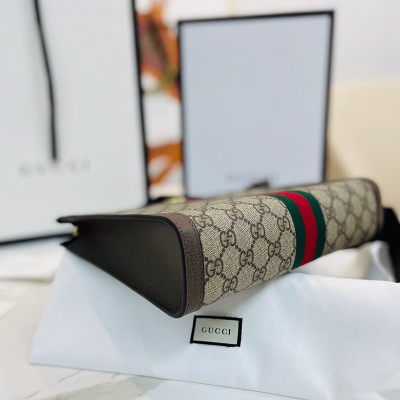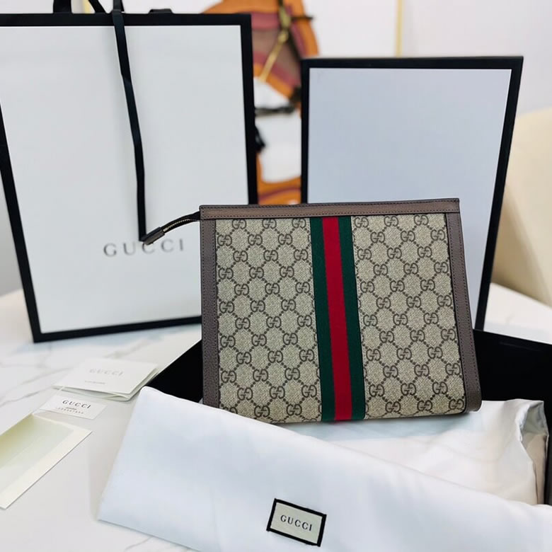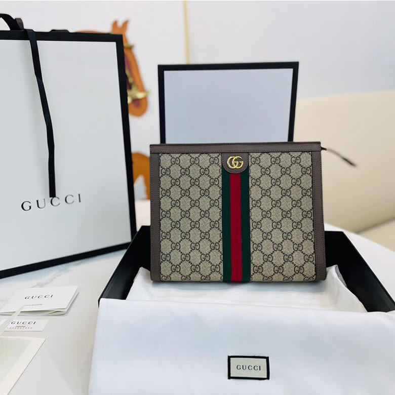 這款拉鏈式手拿包採用GG Supreme帆佈制作,飾以棕色皮革滾邊,為Ophidia繫列再添力作。GG標識於20世紀70年代開始使用,由起源於20世紀30年代的Gucci鉆石菱格紋設計演化而來,是傳承品牌精髓的標誌性圖案之一。這款手袋融合了經典圖案和條紋織帶兩大品牌標誌性元素,以此嚮Gucci悠久的歴史傳承致敬。