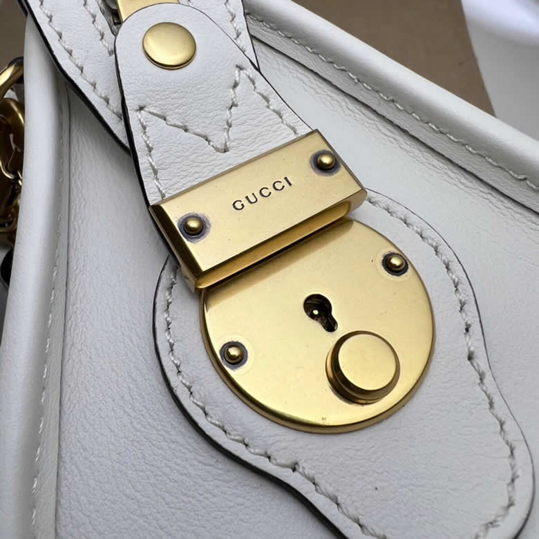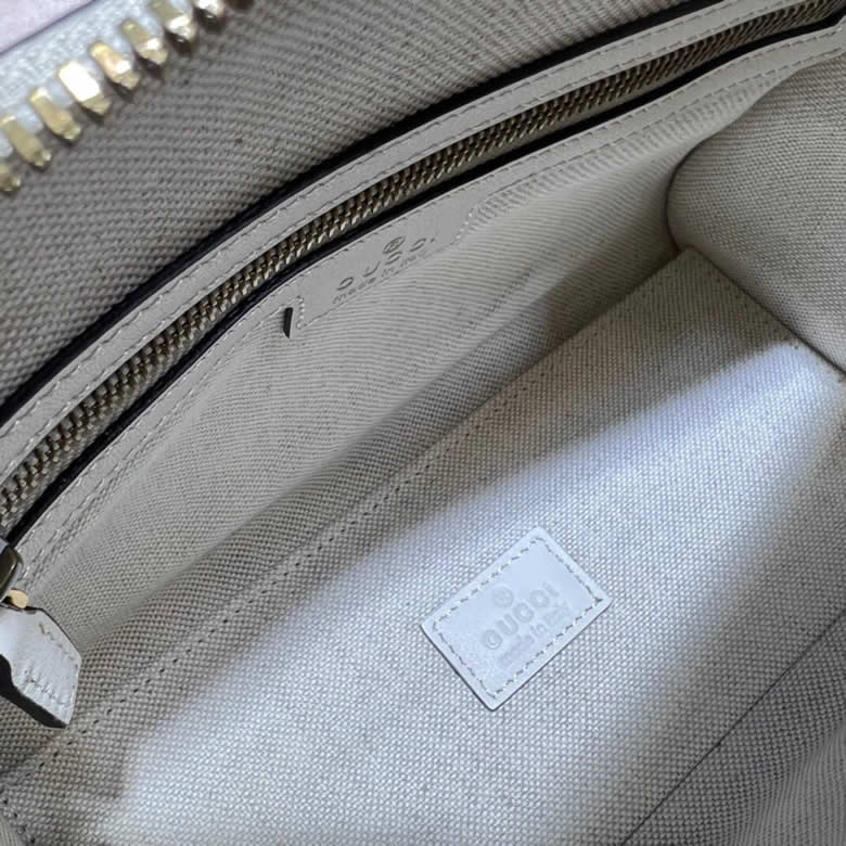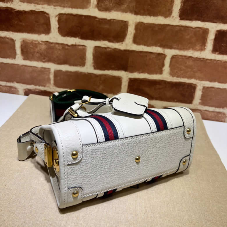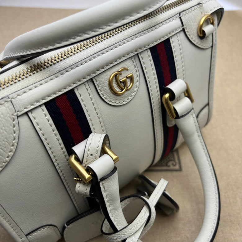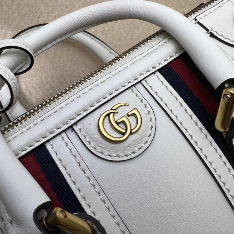 品牌全新《Exquisite Gucci》繫列手提包煥新演繹旅行包風格。白色光面皮革、條紋織帶、雙G配件、品牌經典標誌共同詮釋別致款型。