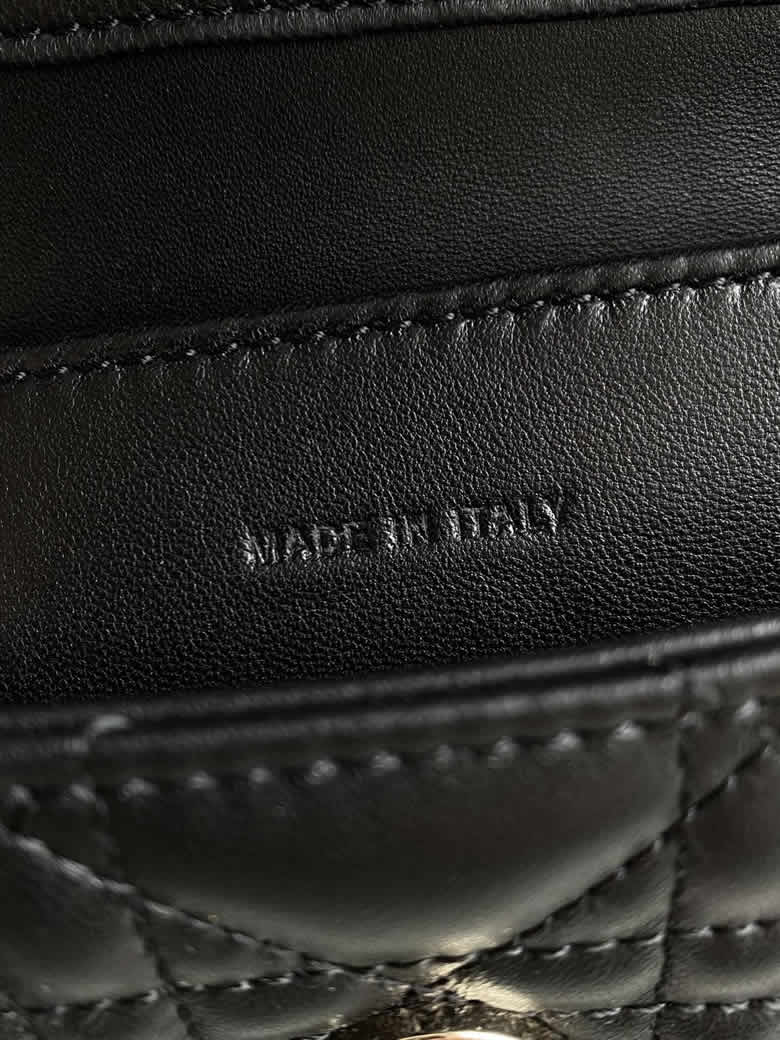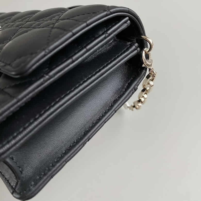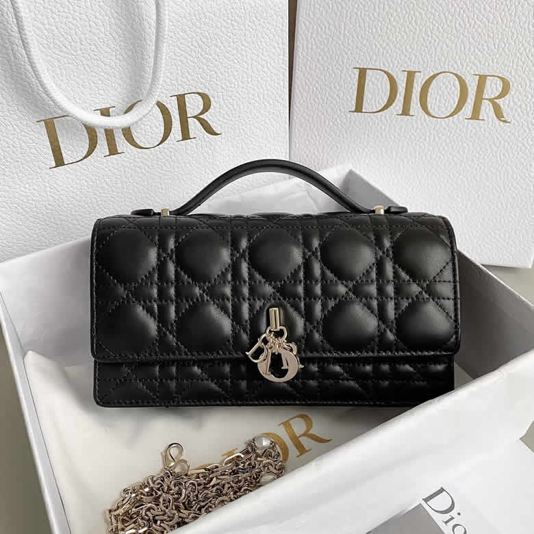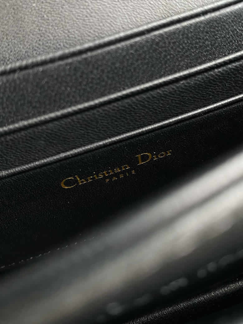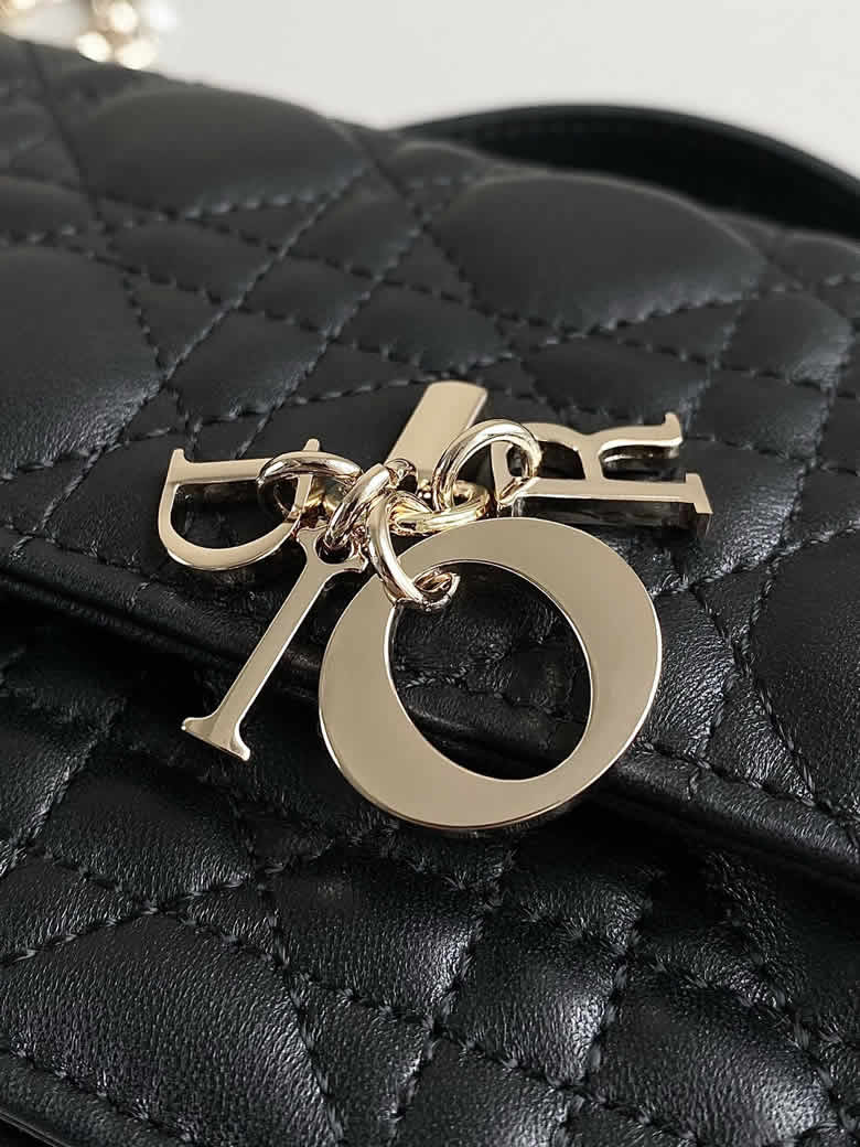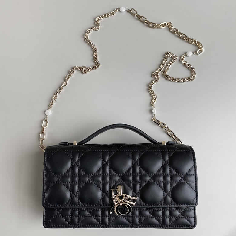 這款 Miss Dior 迷妳手袋是二零二三春夏成衣繫列新品,優雅實用,進一步豐富了 Lady Dior 繫列。採用黑色羊皮革精心制作,飾以藤格紋,翻蓋設計搭配 D.I.O.R. 吊飾提升格調。