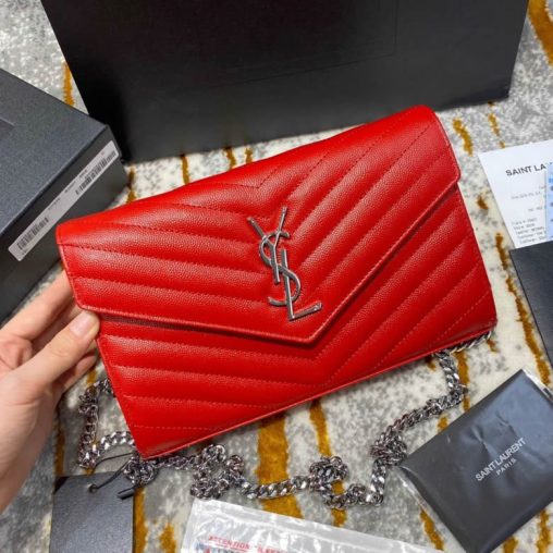 YSL/聖羅蘭MONOGRAM WOC信封鏈條斜挎單肩包 377828紅色銀扣 ¥1780.00